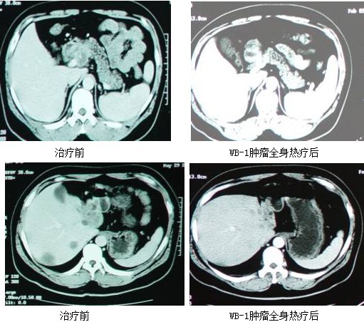 选用GP方案(即吉西他滨+奥沙利铂)化疗,WB-1无创全身热疗前一天使用吉西他滨 ,第二天进行WB-1无创全身热疗,待开始进入39.5℃-41.5.5℃,使用奥沙利铂1.0g,10分钟内滴完。WB-1无创全身热疗后常规行第二周、第三周GP方案化疗。第一次WB-1无创全身热疗后复查CT示胰头肿瘤及肝内转移灶均缩小,CA199降低为137u/ml,后患者因故停止治疗。