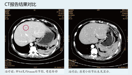 通过“WB-1无创全身热疗”联合化放疗等综合治疗,患者淋巴细胞、单核细胞、血小板较治疗前有明显改善并恢复至正常。肿瘤标志物CA-125、CEA虽还在异常范围,但较治疗前明显好转。流式细胞检测示患者体内T细胞亚群有一定程度的改善。治疗前后CT比较(见下图),提示患者肝S4约6mm结节影(转移灶)消失;