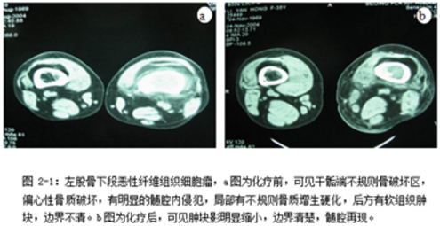 骨病变影像情况 本组患者经过3次以上化疗后,29例患者出现良好的影像学改变,通过学X线、CT表现观察到肿瘤与周围组织影像清晰,软组织肿块缩小,骨瘤减少,钙化修复增多。骨膜反应范围减小,呈修复趋势,肿瘤区边缘清楚,肿瘤与周围组织边界较清晰,肿瘤呈修复趋势,部分区域液化钙化,并出现假包膜包裹。典型病例见图1-1及2-1。