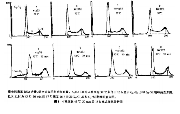 2.1 4种细胞37℃正常条件下16h的细胞周期分布和凋亡的直方图(图1),如图1中的A、B、C、D所示:G0/G1、S1和G2/M期峰都相似,G0/G1,峰前都没有出现Sub-g1;峰。加热43℃30min后,37℃恢复16h,3种p53异常的mutp53、 vectp53和BGC823细胞的细胞周期分布和凋亡的直方图,如图1中的F、G、H图所示,与图1中的B、C、D相似;只有E图显示:加热43℃30min后37℃恢复16h, wtp53细胞G2/M期峰明显变小,S期峰明显增大和在G0 /G1峰前出现Sub-G1峰(42℃ 2h后16h结果与之相似)。而42℃ 2h或43℃ 30min后8h的结果也和图1 E、F、G、H图所示一样,只有wtp53细胞显示G2/M期峰明显变小,S期峰明显增大,而在G0/G1峰前尚未出现Subgi峰。