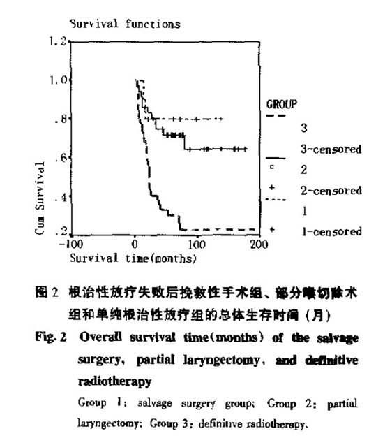 2.1.2声门型喉癌中各组总体生存率:根治性放疗失败后换救性手术组、部分喉切除术组和单纯根治性放疗组的总体生存曲线见图2。根治性放疗失败后挽救性手术组、部分喉切除术组和单纯根治性放疗组曲线间差异有显著性(P=0.0075)。5年生存率比较:根治性放疗失败后挽救性手术组(69.2%}与部分喉切除组(72.4%)组间差异无显著性(P>0.05);两者与单纯根治性放疗组(31.3%)组间差异都有显著性(P<0.05)。