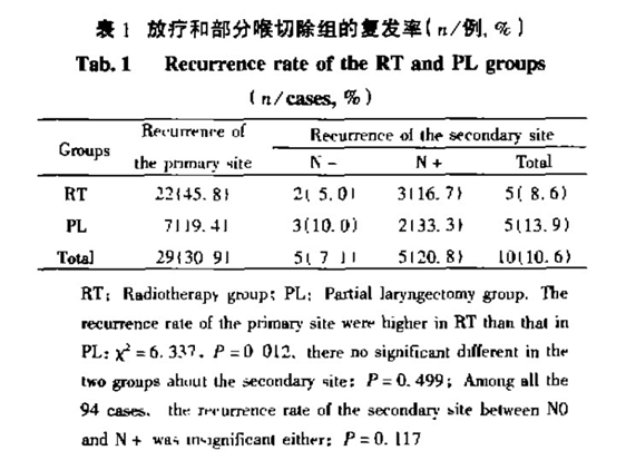 由于病例数较少,未进一步分别比较声门上型声门型喉癌间的复发率和并发症发生率,而将两者合在一起分为放射治疗组(包括单纯根治性放射组和根治性放疗失败后挽救性手术组)和部分喉切除组。两治疗组的原发灶继发灶的复发率见表1。放疔组与部分喉切除组比较:原发灶复发率有显著性差异(x2=6.337,P=0.012};继发灶复发率无明显差异(P=0.499};整个治疗组中N-与N+继发灶复发率比较无明显差异(P=0.117)。