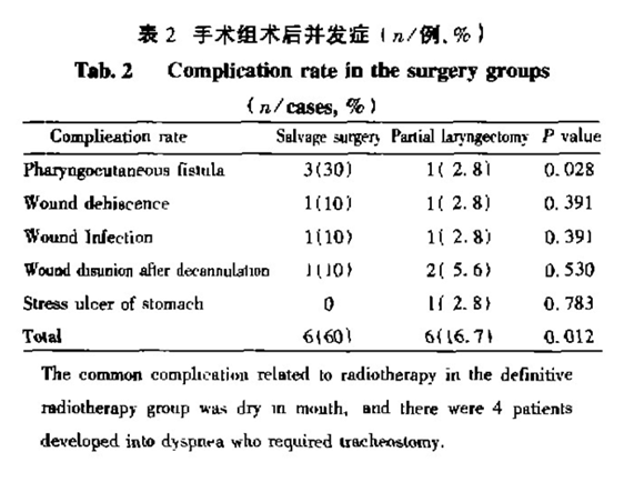 在我们以前的资料中也显示了根治性放疗失败后挽救性手术组的治疗效果和部分喉切除组的生存率相当,只是病例数较少而未做进一步的统计分析。本组资料显示:在声门型喉癌中两者的5年生存率分别为69.2%和72.4%,在总体T3期病例中两者的5年生存率分别为79.0%和71.6%。我们进一步比较了两者之间的手术并发症,挽救性手术治疗组的并发症发生率高于部分喉切除组,这可能是因为挽救性手术组的放疗剂量高于后者的缘故,高剂量的放射引起术后切口愈合不良。但也有认为两组的并发症无明显差异[4]。