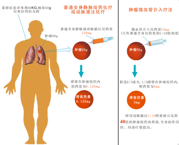 全身化疗时,化疗药物全身分布,肿瘤组织内药物浓度低,经常达不到足够的肿瘤细胞杀伤力,而全身其他脏器内药物分布不可忽视。因此,全身副作用大,而肿瘤组织内杀伤力不满意。为此,人们常改用介入法动脉灌注给药。将导管插入到肿瘤组织附近的供血动脉内,直接动脉灌注给药。这样,肿瘤区化疗药瞬间浓度大大提高,但缺点是药物很快随血液向全身流走,达不到高浓度化疗药持续发挥作用。
