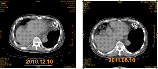 碘-125放射性粒子植入即刻,3月后复查肿块大部萎缩,9月时复查心包内肿块完全萎缩。