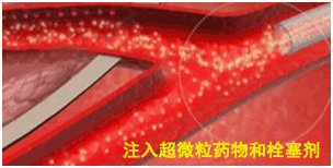 第二步、阻断肿瘤细胞营养供给:栓塞剂堵塞肿瘤供血血管,切断肿瘤营养供应,超微粒药物停留在肿瘤内,发挥作用消灭肿瘤。