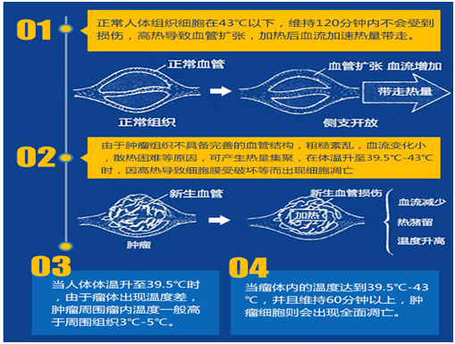 肿瘤的生长依靠血液供应,血液供应好,肿瘤生长就快,而肿瘤在生长的同时肿瘤细胞会分泌一种血管内皮生长因子(VECF),这种物质能使肿瘤周围生长许多新生血管,这些新生血管的形成为肿瘤的生长,转移,复发起到了非常重要的作用,但是当肿瘤内的温度达到43℃以上时,肿瘤细胞就不分泌这种物质,新生血管也就不能生成,没有血供,肿瘤就会被“饿”死。