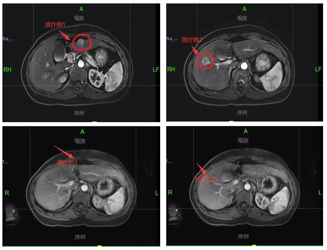 经过一个疗程的放射治疗,复查上腹部MRI:1.“肝癌综合治疗后”改变,病灶较前明显缩小。(肝S5内可见结节状异常信号影,T1WI呈低信号,T2WI、T2WI-FS呈稍高信号,DWI高b值呈高信号,ADC呈低信号,形态规则,边界清晰,最大者大小约为0.7cm×1.0cm,增强扫描病灶明显强化,病灶较前明显缩小。原S3、S2病灶未见显影,增强未见强化。