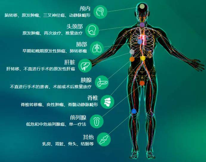 立体定向放疗(SBRT),俗称体部X刀,大剂量、低分次,结合图像引导放疗,治疗早期非小细胞肺癌等肿瘤,可以得到和手术治疗相同的根治结果,为肿瘤患者,尤其是心肺功能不能耐受手术治疗的患者提供了很好的选择。同时对于如鼻咽癌补量照射、肺癌、肺转移癌、肝癌、胰腺癌、腹部盆部单发转移癌等的治疗也有很好的疗效。