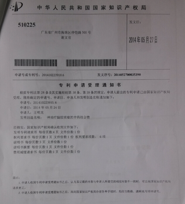 胡群峰教授专利技术5:一种治疗脑胶质瘤的中药组合物