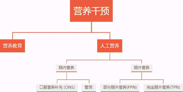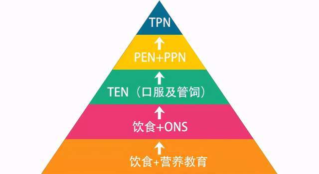 首先选择营养教育,然后依次向上晋级选择口服营养补充(ONS)、全肠内营养(TEN)、部分肠外营养(PPN)、全肠外营养(TPN)。参照ESPEN指南建议,当下一阶梯不能满足60%目标能量需求3~5天时,应该选择上一阶梯。