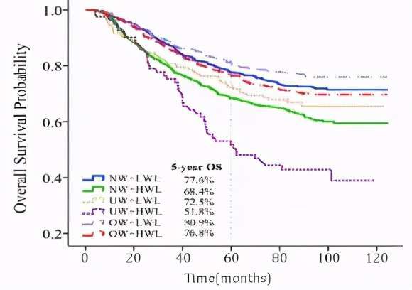结果发现,体重下降更多的病人死亡率和癌症复发率明显更高。尤其是本来体重就偏低的患者,高体重丢失组对比低体重丢失组的五年生存率是51.8%vs72.5%。